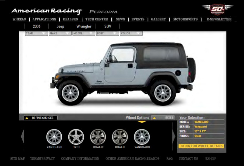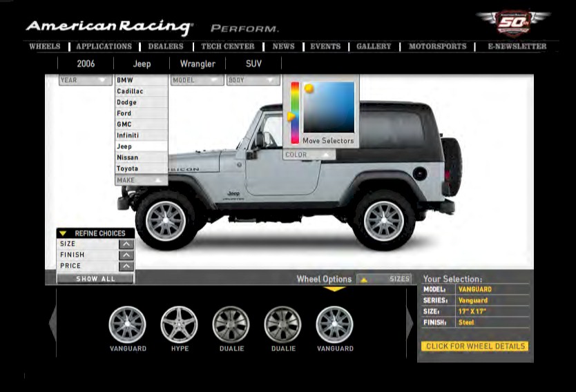 American Racing, the preeminent manufacturer of custom wheels for the automotive industry, wanted to bring their brand to the 21st century and Evolve Media did just that. Redesigned their main corporate site along with five other sub-branded, market specific, product sites. In addition, American Racing wanted to decrease their retail return rates. Evolve Media developed a way for customers to envision their automobile, year, make, model, and color with the desired wheel before the purchase. Thus reducing the wheel return rates by 38%.