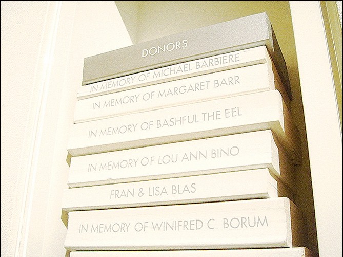 A simple color scheme using whites and grays conveys the graphic information. Used books were sprayed with white paint and grey vinyl lettering was applied to the spine. To distinguish between the two categories (Life Members and Donors), the colors were reversed. The notion of a library shelf is turned on its side by stacking the books, allowing the library staff to delete and insert books and maintain alphabetical order for both categories.